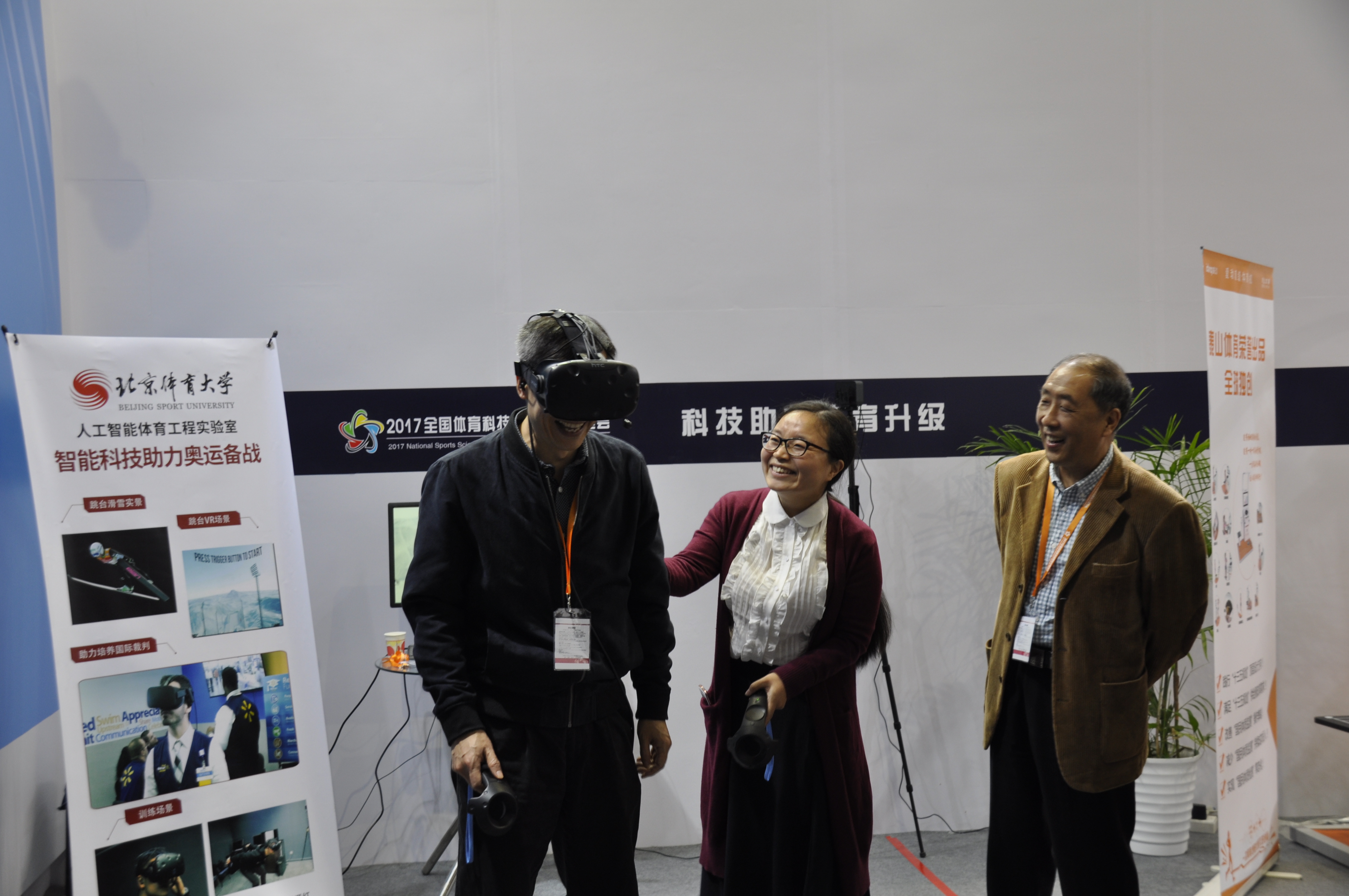 展会上,胡扬副校长陪同李业武司长、国家体育总局科研所领导、各大体育院校领导和多位专家、学者参观体验了我校的成果展厅,听取了我校各项科技成果的汇报。李业武司长等领导亲自体验了跳台滑雪虚拟场景,对虚拟现实技术场景在体育应用,尤其是训练和教学中的应用前景给予了积极的肯定。